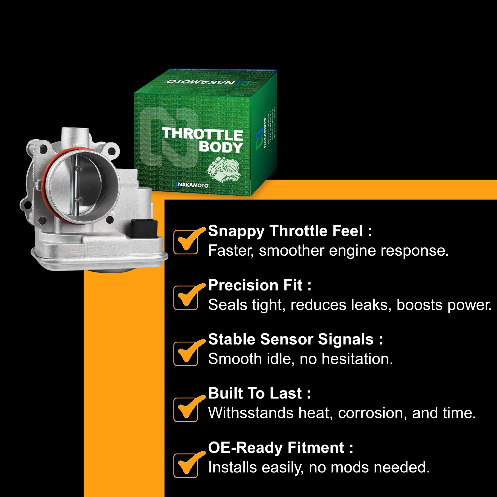 Each Nakamoto Fuel Injection Throttle Body is made of premium quality metallurgy and is machined by advanced CNC cutting technology of OE Standard precision to improve throttle response and engine performance.